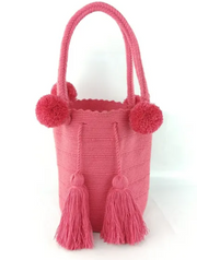 The CARLOTA mochila bag was made in La Guajira Desert of Colombia. Each bag takes around 14 – 21 days to complete using the an intricate crochet/weaving technique. The colorful strap is a work of art. Accented with colorful pom poms.