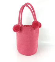Colors: Bucket is solid turquoise blue. Multicolor handle, pom poms and tassels in hot pink, turquoise, teal, purple and yellow.